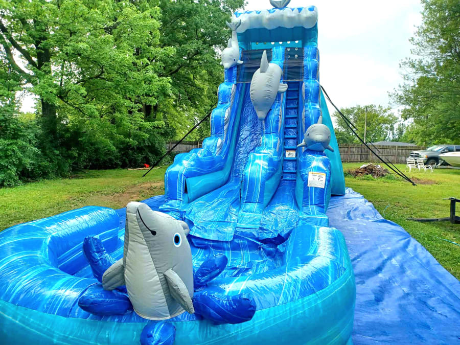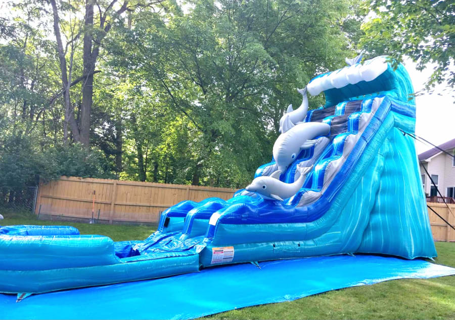 Perfect for kids, teens and adults! Our Dolphin Daze Waterslide is just what's needed for any great party to add on that WOW factor! Our inflatables are cleaned and disinfected after every use. As you climb the stairs all the way to the top, plunging down the slide under the sprinkler system, and making a splash into the pool at the bottom, you are guaranteed to make memories that will last a lifetime with Haywire Event Rental!