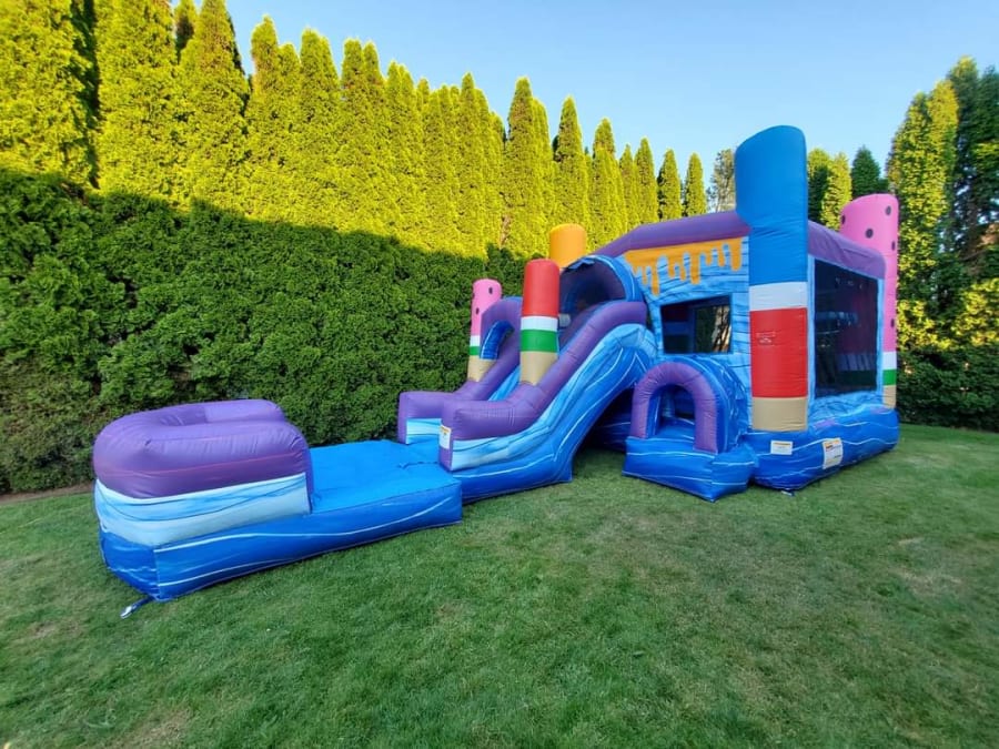 Ice Pop Combo is a fun design theme that can be perfect for many party's! Candyland, Summer, Ice Cream Socials, and many more! This inflatable includes bounce house, slide, basketball hoop, climbing stairs, and small tunnel under the slide! Our bounce house rentals are vibrant and eye catching! Can be used wet or dry.