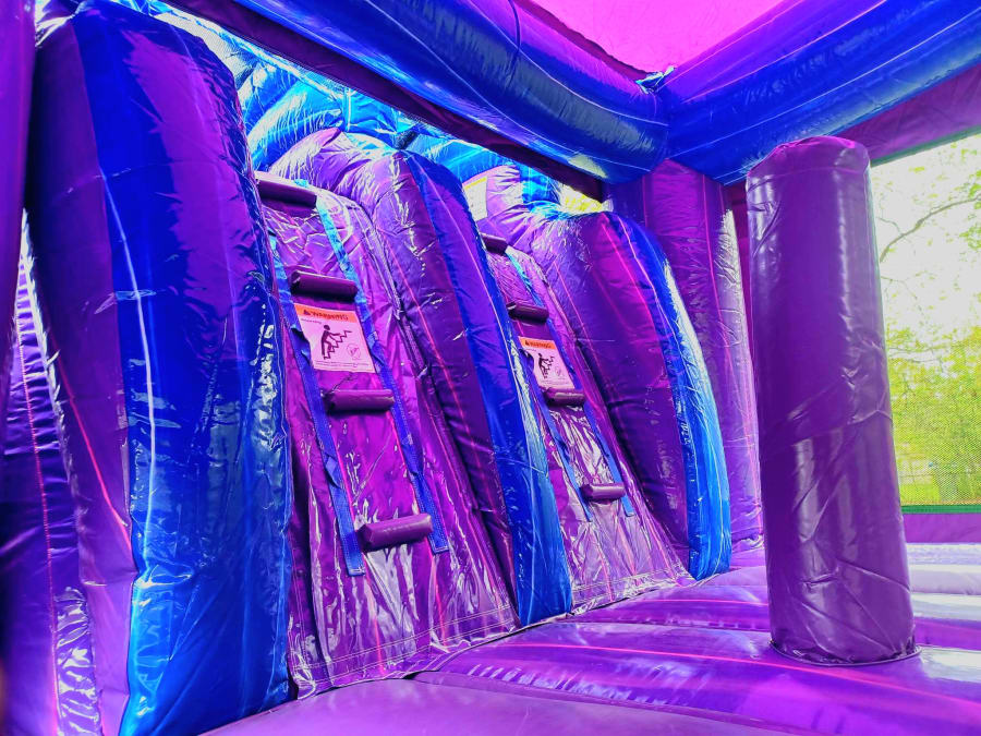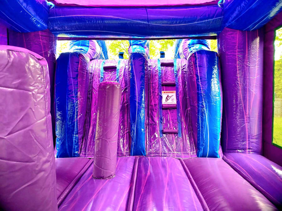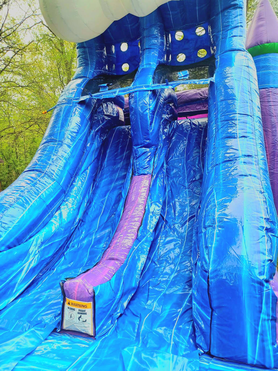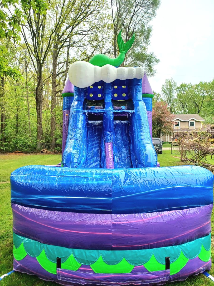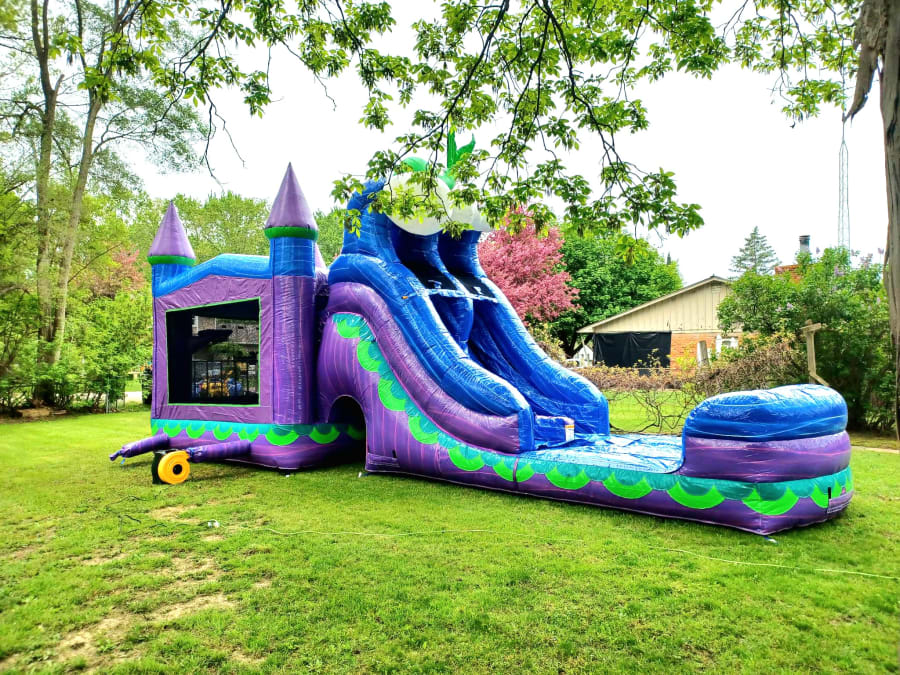 Aquamarina will be sure to make a splash for your party and guests! This inflatable includes tunnel, pop up obstacles, basketball hoop, bounce house, and double lane waterslide! The green mermaid tail can be pinned down by request.