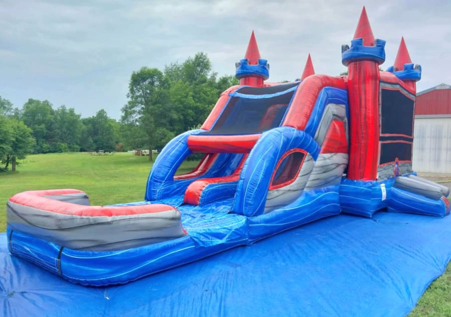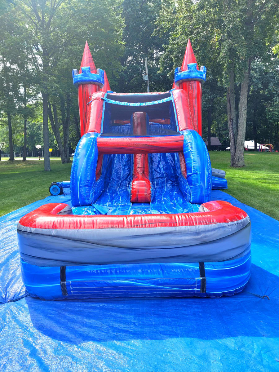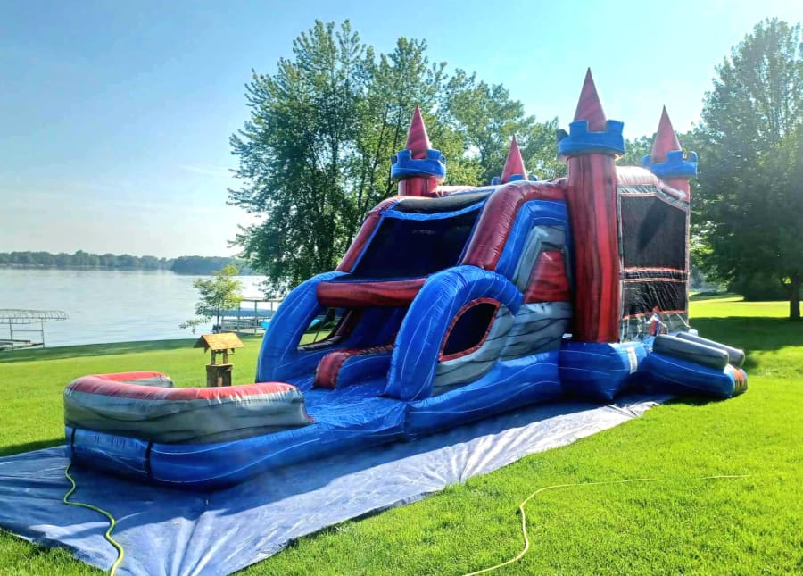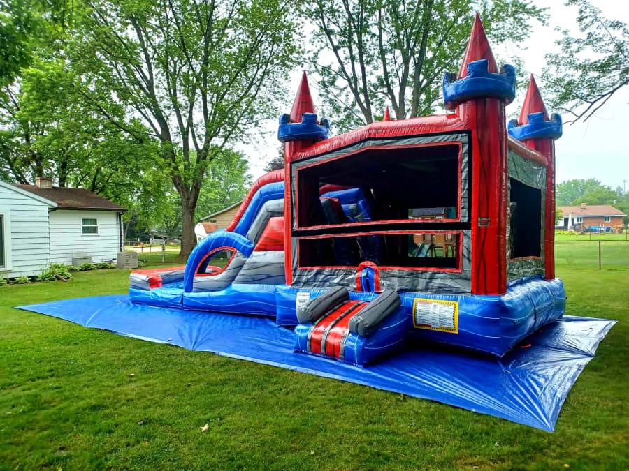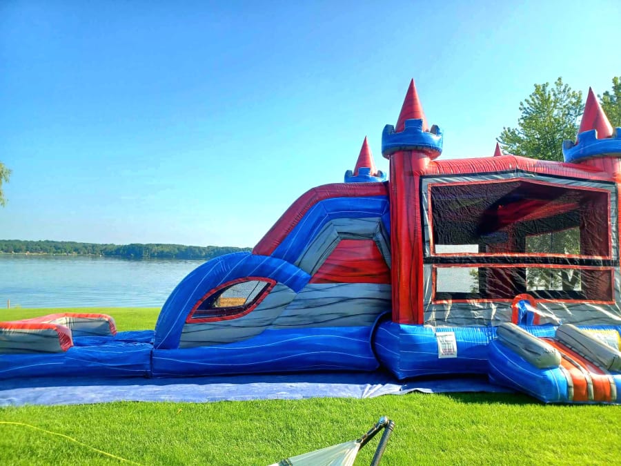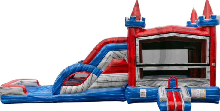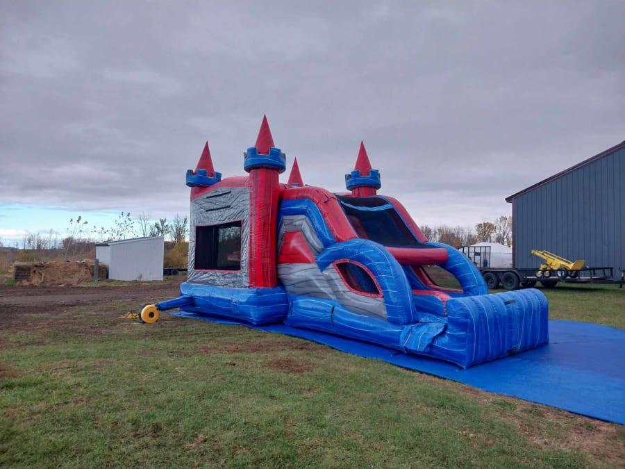 Titan Dual Lane Combo can be used as a dry inflatable, as well as a wet waterslide for those hot summer days! This bouncey castle rental offers a sleek design (perfect for any superhero, star spangled celebration!), bounce house area and 2 slides for double the fun, hose attachment option, and splash pool. Check out our other Titan options!