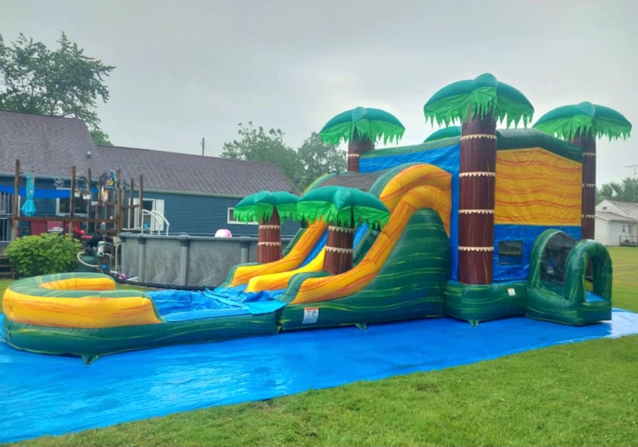 Cali Palms Dual Lane Combo Bounce House Rental can be used as a dry inflatable, as well as a wet waterslide for those hot summer days! This bouncey castle rental offers a sleek design (perfect for any tropical, dinosaur theme, or even just a hot summer day!) The bounce house offers a large jump area and 2 slides for double the fun, hose attachment option, and splash pool. Check out our other Cali options!